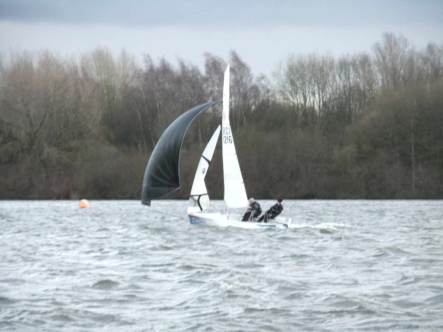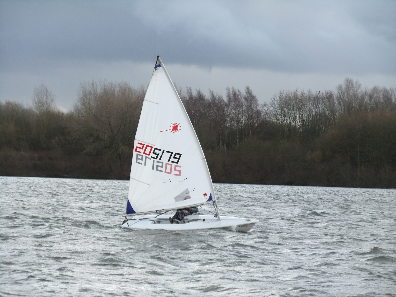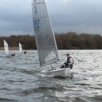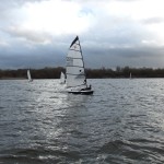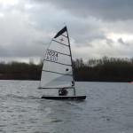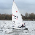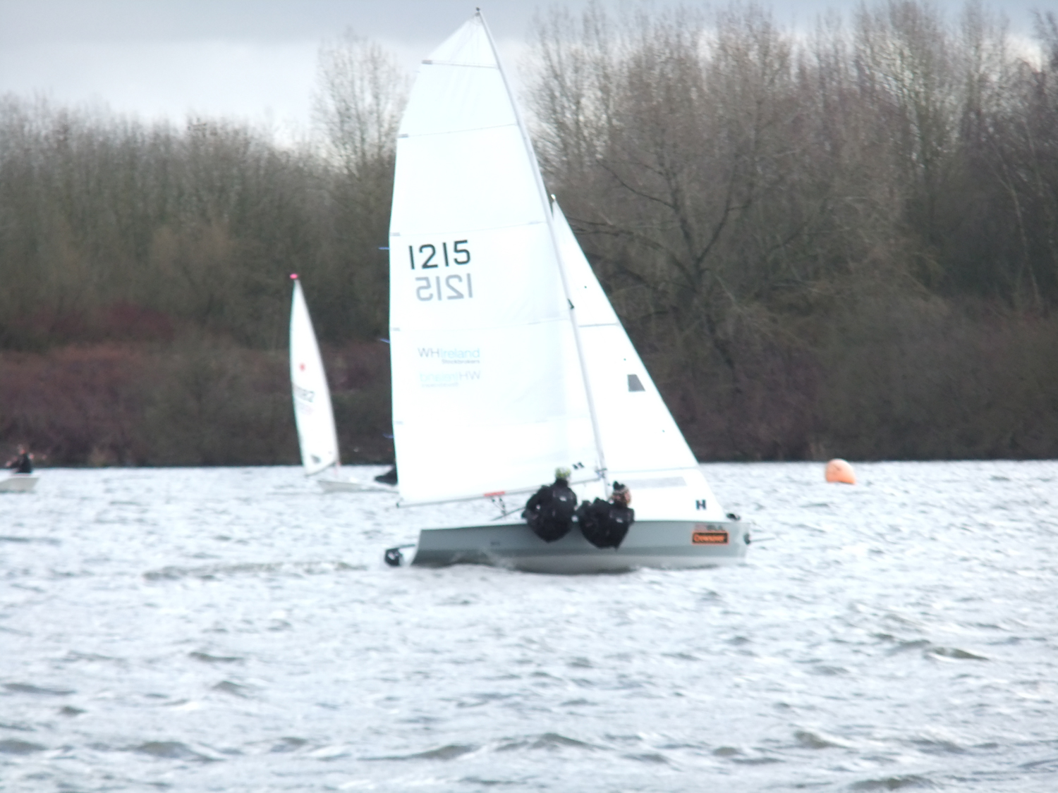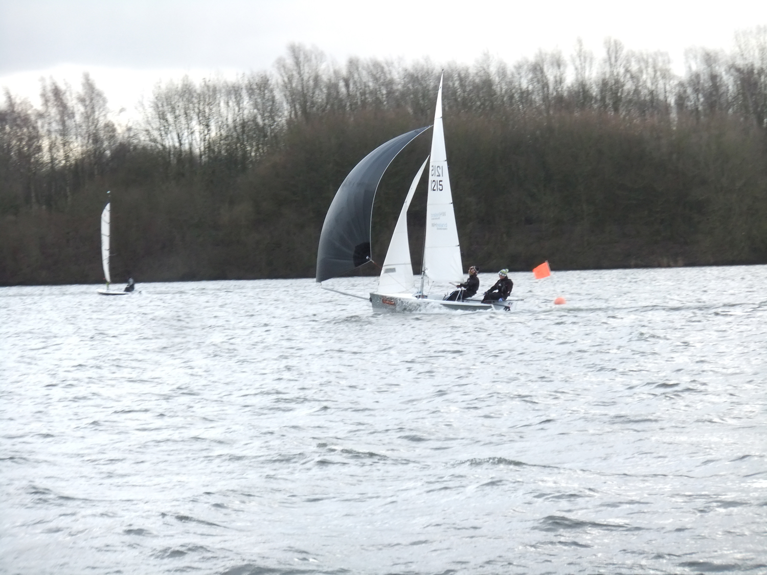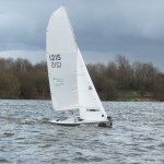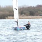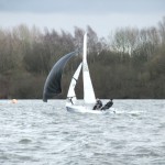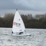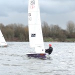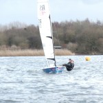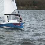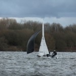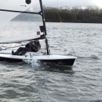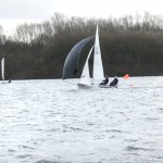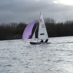 Races 11 & 12 on Sunday 9th February 2014. With some events cancelled this weekend due to adverse travel conditions and a forecast for near gale force winds it was no surprise that upon arriving at the club to find a very cold and gusty breeze only 35 boats ventured out onto Pennington Flash for races 11 & 12 in the ‘Crewsaver’ sponsored Tipsy Icicle series at Leigh & Lowton sailing club.As the fleets launched there was a 19 knot breeze from the south west. The direction allowed the race team to start at the bottom end of the water and set a long beat and four off wind legs for the non-asymmetric fleets. Prior to the start the wind strength increased and the fleet were hit by gusts of 34 knots (Force 8) which resulted in many capsized boats, a bent mast for one of the Solo’s and the asymmetric fleet leaders, the Allen brothers, having their slot gasket rip off as they sailed off wind thus causing them to return to shore. Many other boats returned to shore either before the start or retired during the course of their race.