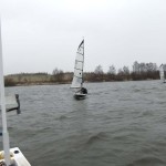 Competitors were met by a grey overcast sky with a hint of rain in the air and a gusty southerly Force 5 breeze. The decision was made to go afloat and 39 boats headed out to the start area for the usual starting format. Given the wind direction the race officer set two beats using the width of the Flash which proved to be more shifty as the boats neared the south shore, as a few boats found out to their cost with capsizes to windward, but they were compensated by the long off wind legs which, when the 31 knot gusts hit them, made for many a happy (and slightly scared) sailor provided they stayed upright. During the first race the wind settled to an average speed of 16 knots with many gusts of up to 31 knots recorded.