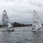Solo wise it was series leader Patrick Hamilton (Burwain) who hit the front followed by Phil Barnes (Budworth SC) and Paul Heath.  As the race progressed it was very close between these three and in the gusty and shifting breeze it was anyones to win or lose.  In the end Heath struck lucky with a few wind shifts to edge in front and then went on to extend his lead to take the win from Hamilton in second, Barnes third and Bristow in fourth.