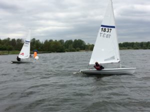 Saturday was cold and grey with a shifty easterly breeze that was gusty enough to cause a few capsizes. The fleet of 17 boats was smaller than expected but contained 7 of the top 10 at last year’s Nationals and the racing was very competitive. Ian Jones and Isaac Marsh, both from Dovestone SC, got away well in the first race and had a close battle on every leg of the course. The following group of Veronica Falat, Steve Blackburn and Alan Gillard were chasing hard and, in the shifty conditions approaching the windward mark for the final time, Veronica found a port lift that squeezed her past Ian and Isaac who were struggling on the starboard lay-line. Veronica hung on to the lead on the downwind legs and took the win with Ian 2nd and Isaac 3rd.