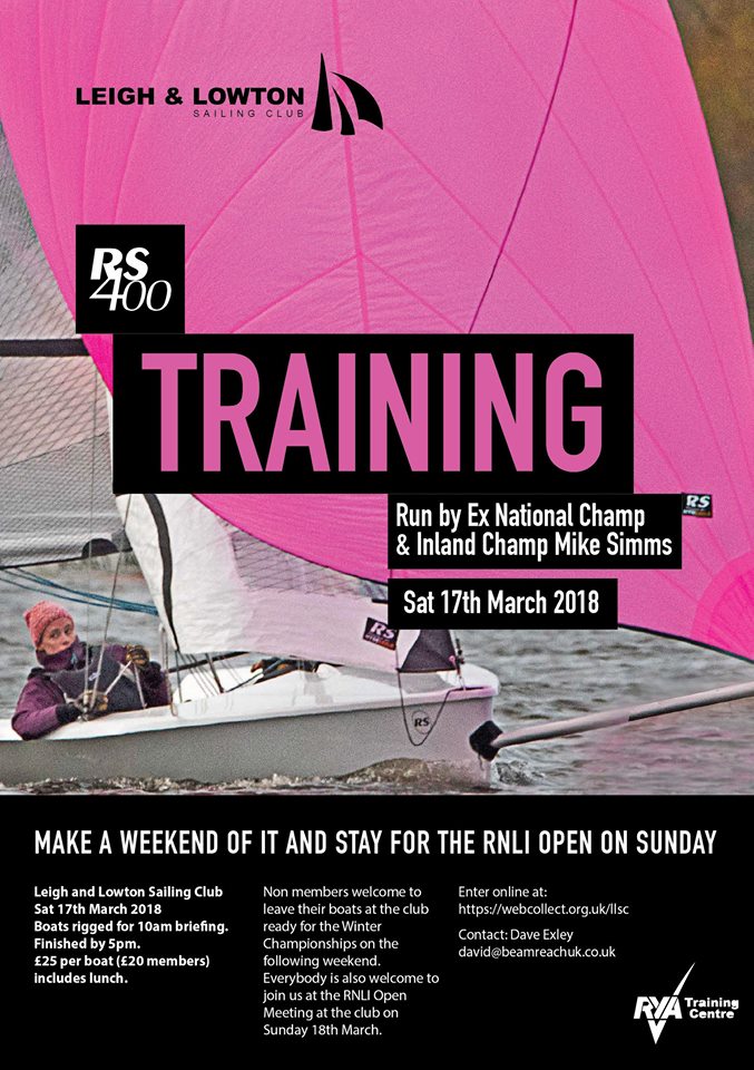 Saturday 17th March: The Long Awaited RS400 Specific Training Day at Leigh and Lowton. With Mike Sims – Ex National & Inland Champ. Put it in your diaries now!! Only £25 per boat includes lunch!! Join us for the annual RNLI Open Meeting on the Sunday as well if you like. Join us for some 400 banter in the pub on Sat night – all welcome. Leave your boat at the club until the following weekend for the RS400 Winter Championship.